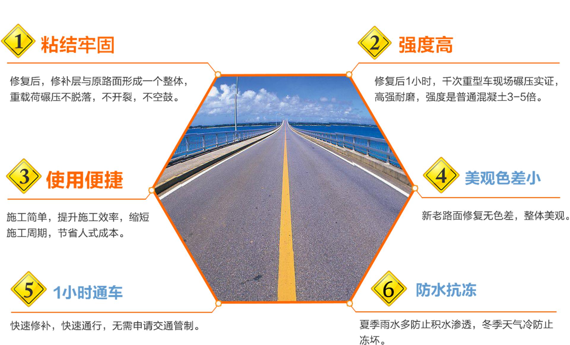高聚物混凝土道路快速修補(bǔ)料分薄層修補(bǔ)、深層修補(bǔ)、墻面修補(bǔ),是由多種無(wú)機(jī)與高分子材料組成的一種反應(yīng)型快速修補(bǔ)材料,具有快硬、早強(qiáng)、高強(qiáng)、抗?jié)B、抗裂、耐磨、耐久等多種功能,與新、老混凝土粘結(jié)牢固,施工簡(jiǎn)便等特點(diǎn),其抗壓強(qiáng)度和抗折強(qiáng)度大大高于普通混凝土的強(qiáng)度。
